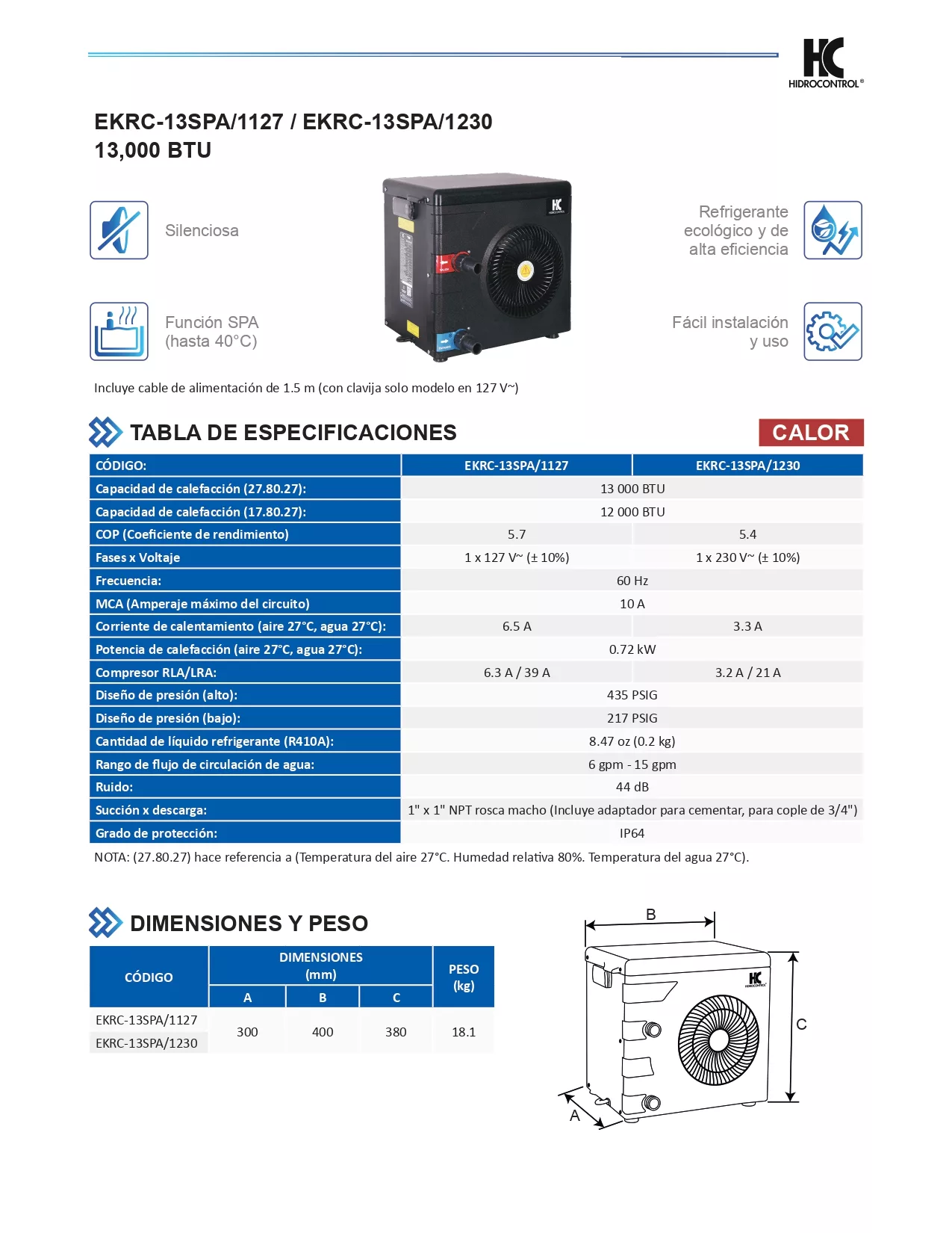 Bomba de calor 13,000 btu |110 V | Hidrocontrol