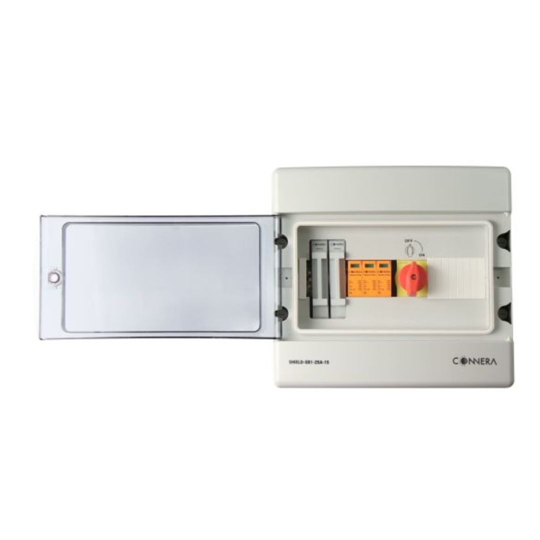 | Incluye | 1 Gabinete plástico con protección UV y retardante de llama. Cuenta con 1 clema a tierra, 2 portafusible de toque seguro con 2 fusibles de 25 A y 2 de 32 A, 1 supresor de picos de 3 polos (Imax 40 kA, In 20 kA, Up 4.8 kV) y 1 desconectador de 2 polos (Ie 65 A). |